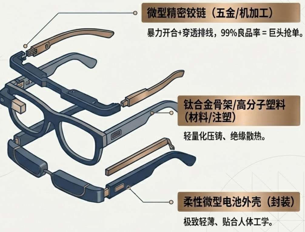 材料/注塑厂的利润池: 钛合金骨架的轻量化压铸、能散热但不导电的特殊高分子塑料、能弯曲的柔性微型电池封装外壳。
